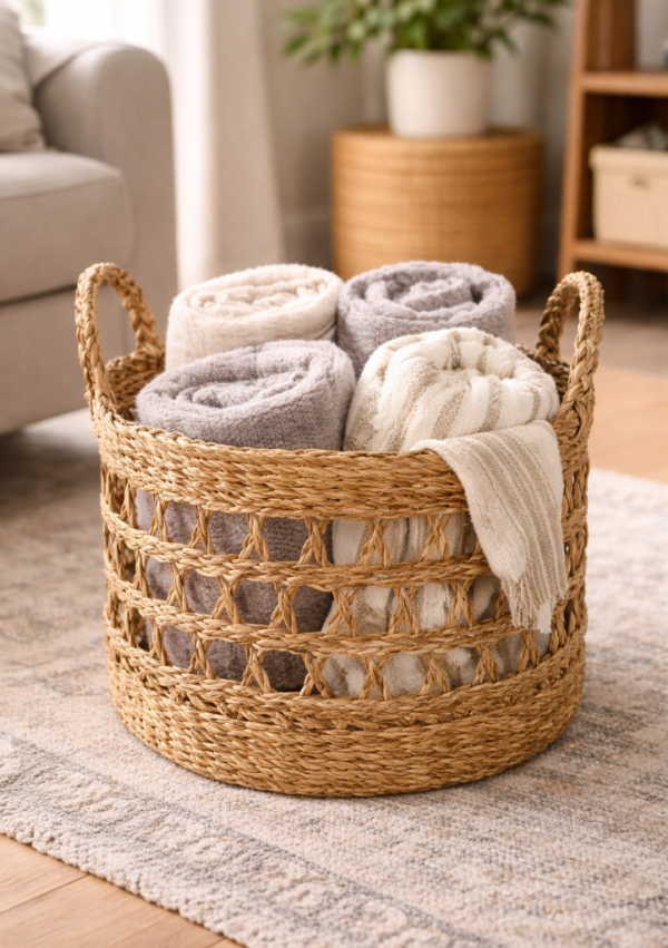 Each basket is individually hand-woven by skilled artisans, featuring a beautifully detailed texture that adds warmth, depth, and a handcrafted touch to your home décor.