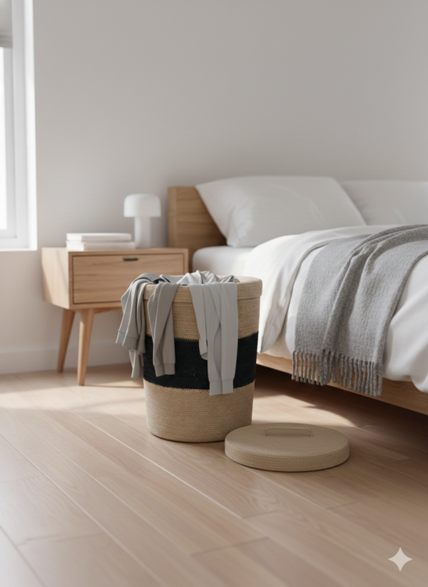 - Two-Tone Handwoven Jute Laundry Basket with Lid