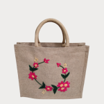 This Handcrafted Embroidered Jute Tote Bag is made from 100% natural jute, offering an eco-friendly and sustainable alternative to plastic bags. The front features a beautifully hand-embroidered floral tree design, giving the bag a unique, artistic, and elegant look.