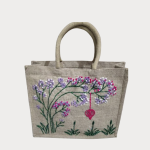 This Handcrafted Embroidered Jute Tote Bag is made from 100% natural jute, offering an eco-friendly and sustainable alternative to plastic bags. The front features a beautifully hand-embroidered floral tree design, giving the bag a unique, artistic, and elegant look.
