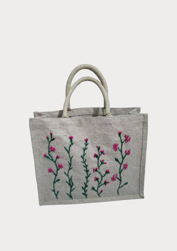 This Handcrafted Embroidered Jute Tote Bag is made from 100% natural jute, offering an eco-friendly and sustainable alternative to plastic bags. The front features a beautifully hand-embroidered floral tree design, giving the bag a unique, artistic, and elegant look.