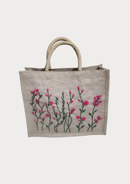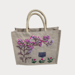 This Handcrafted Embroidered Jute Tote Bag is made from 100% natural jute, offering an eco-friendly and sustainable alternative to plastic bags. The front features a beautifully hand-embroidered floral tree design, giving the bag a unique, artistic, and elegant look.