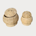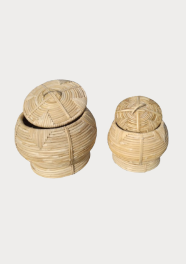 This round lidded basket set from Loom & Leather provides compact storage with a decorative woven lid. The rounded profile softens interiors and works well for small-item organization.